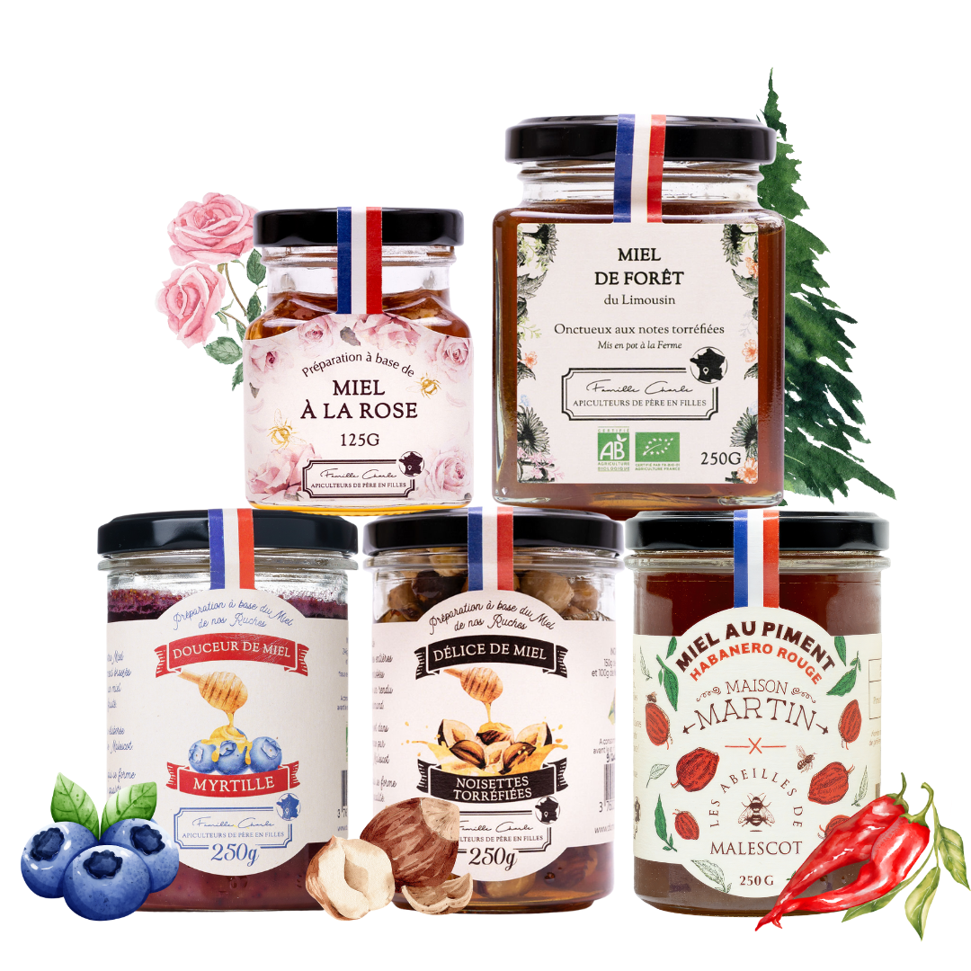 Découvrez notre Délice de miel aux noisettes (250g), la délicatesse florale du miel à la rose, et les notes fruitées du miel à la myrtille (250g). Laissez-vous tenter par le caractère intense et authentique de notre miel de forêt (250g), et osez l’association surprenante et épicée du miel au piment (250g).