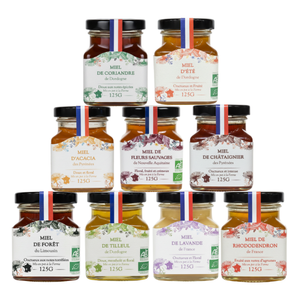 Découvrez les terroirs français avec notre coffret dégustation de 9 miels de 125g.