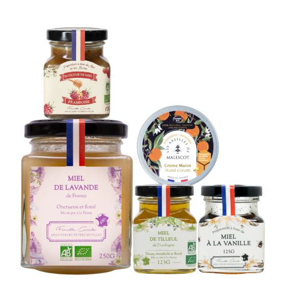 Une sรฉlection raffinรฉe de miels savoureux, de bonbons dรฉlicats et dโune crรจme mains parfumรฉe pour une pause gourmande et rรฉconfortante.