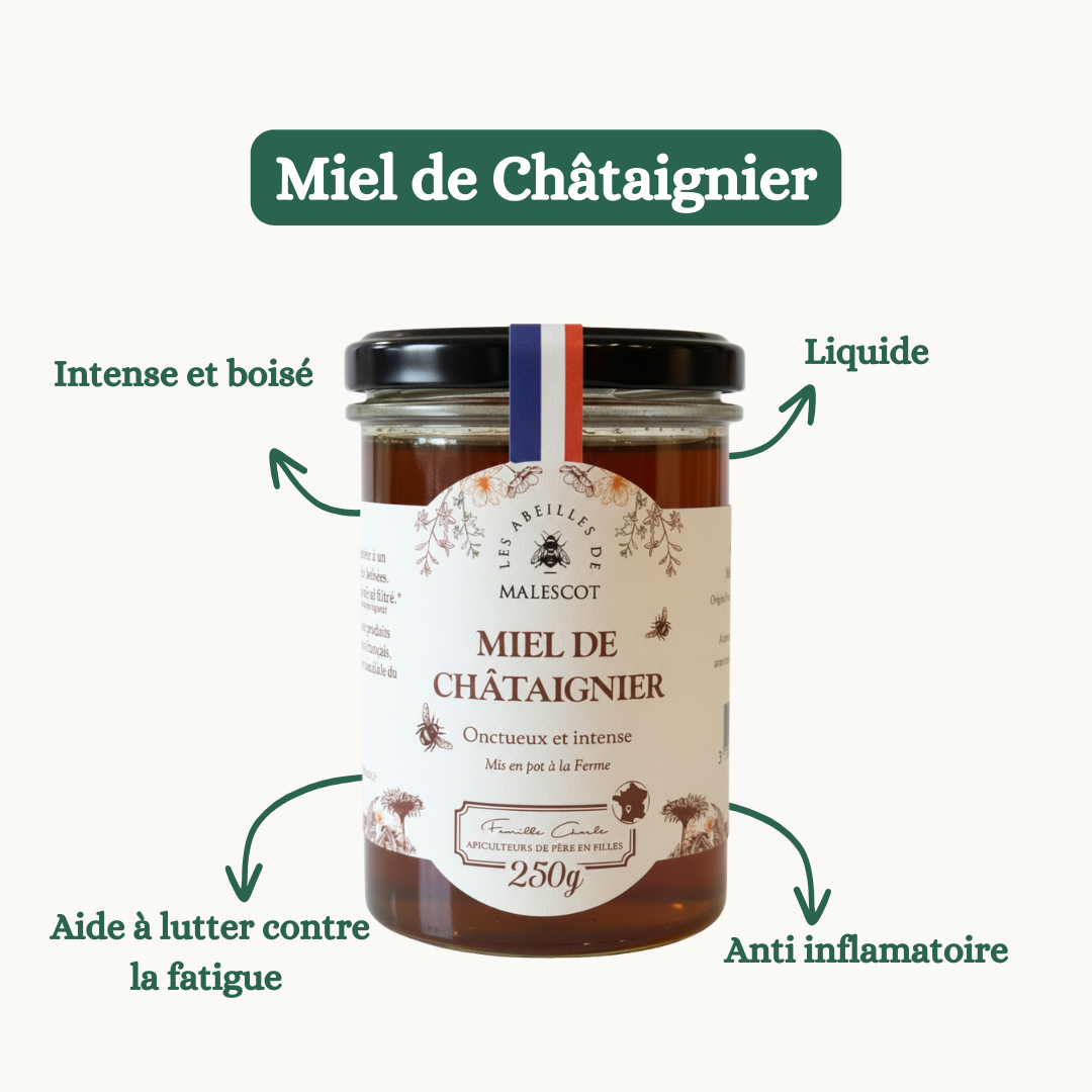 Découvrez le miel de Châtaignier, un nectar puissant issu des forêts préservées des Pyrénées. Avec ses notes boisées et légèrement amères, ce miel au goût intense séduit les amateurs de caractère. Sa texture onctueuse et sa richesse aromatique en font un miel d’exception, apprécié pour ses saveurs profondes et corsées.